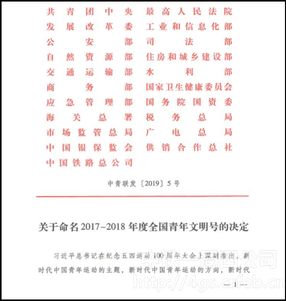 6月20日,根據(jù)《關(guān)于命名2017-2018年度全國(guó)青年文明號(hào)的決定》中青聯(lián)發(fā)[2019]5號(hào),公司大瑞項(xiàng)目部青年突擊隊(duì)被命名為“2017-2018年度全國(guó)青年文明號(hào)”。
