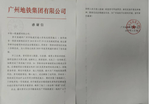 廣州地鐵集團向中鐵一局發來感謝信