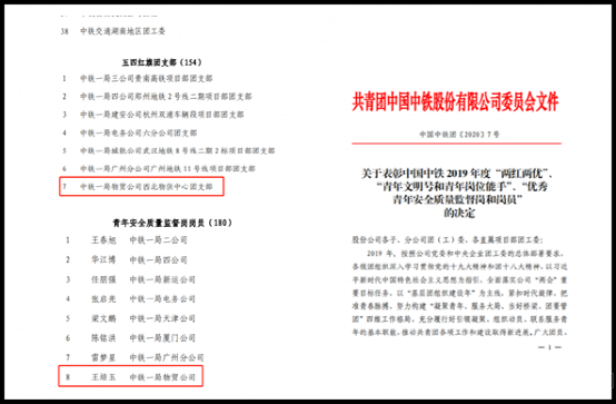 物貿公司團委獲股份公司2019年度信息工作先進單位榮譽稱號;西北物供中心團支部獲股份公司五四紅旗團支部榮譽稱號;高媛獲優秀團干部榮譽稱號;東北物供中心劉魏榮獲青年崗位能手榮譽稱號;鋼結構制造分公司王培玉榮獲股份公司優秀青年安全監督崗崗員榮譽稱號;華北物供中心朱文濤等3名優秀共青團員、西南物供中心竇平等4名優秀團干部獲集團表彰。